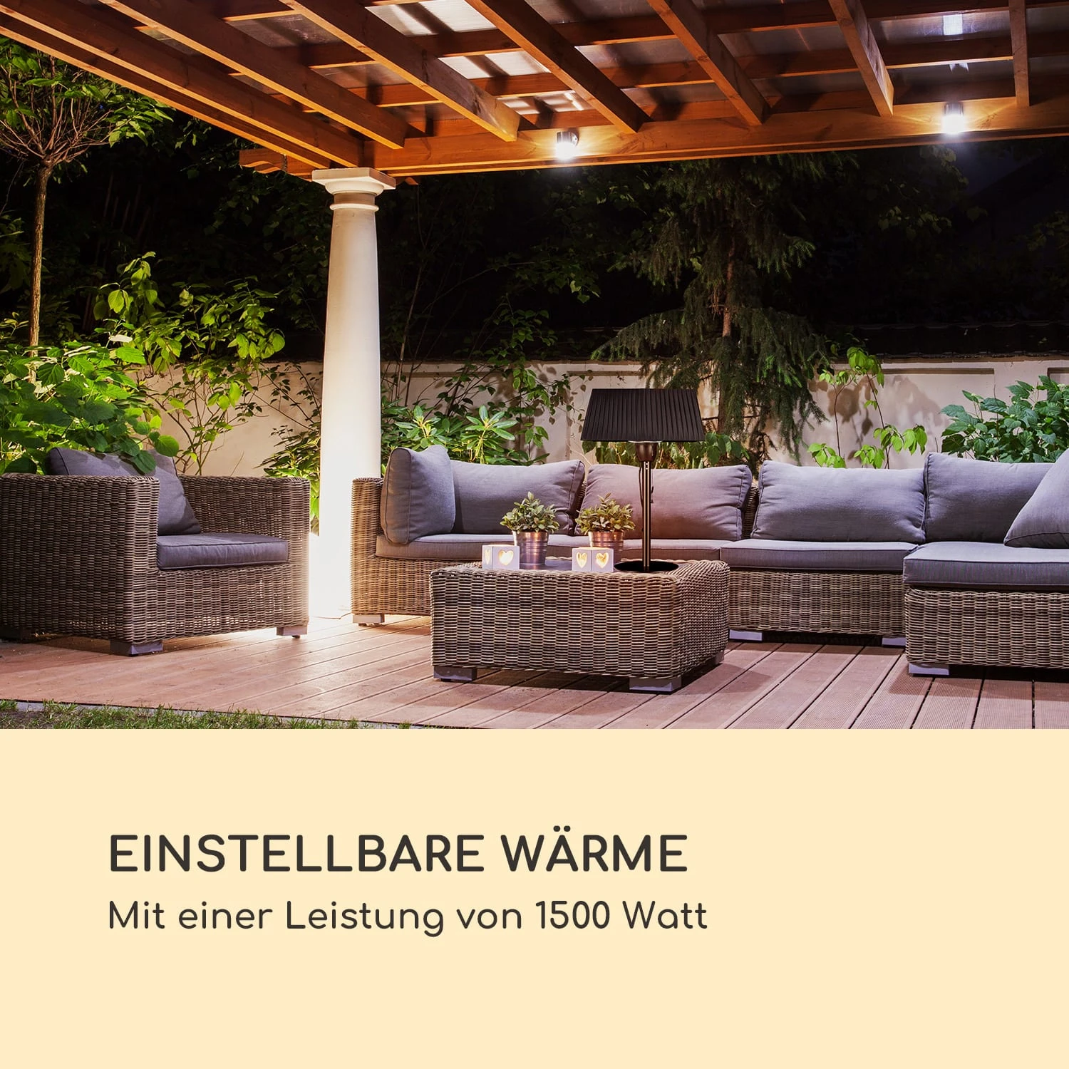 Der blumfeldt Loras Style Tisch-Heizstrahler mit robustem und elegantem Lampenschirm mit stilvollem Stoffbezug bereichert jede Sitzecke im Freien durch sein ansprechendes Design im Retro-Look. Ein 1500 Watt starkes Karbon-Infrarot-Heizelement versorgt seine Umgebung dabei schnell und zuverlässig mit angenehmer Wärme. Dank des IR ComfortHeat-Systems wird dabei nicht die Luft, sondern direkt die angestrahlten Gegenstände und Personen erwärmt. Ein- und ausgeschaltet wird die Heizlampe ganz simpel und stylish per Zugband. Durch die Schutzart IP44 ist der Heizstrahler vor Spritzwasser geschützt und dadurch auch bei leichtem Regen einsetzbar. Standsicherheit erhält der Loras Style durch einen ca. 28 cm durchmessenden Standfuß, der durch seine schlichte Eleganz der Konstruktion ein stilvolles Aussehen verleiht.