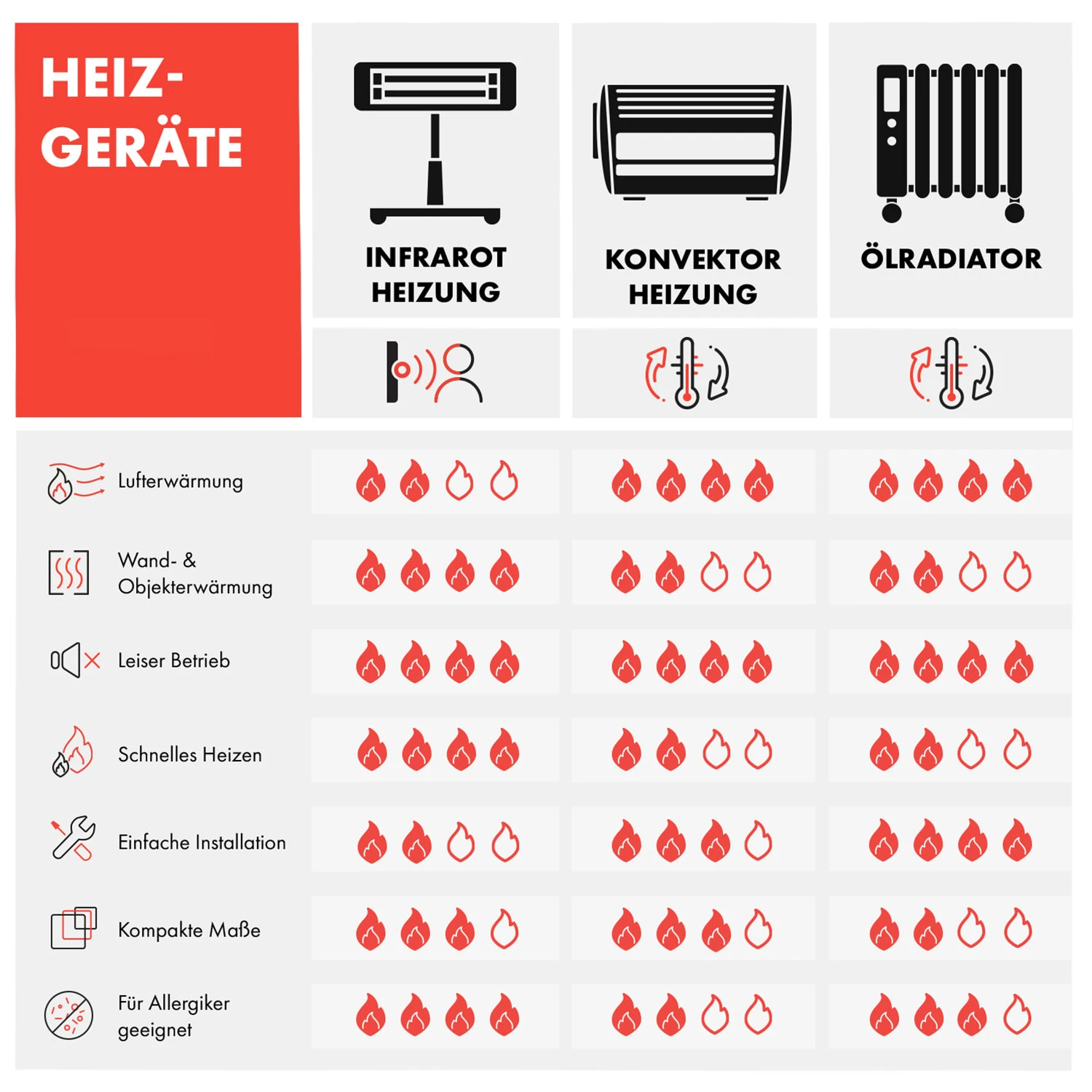 - Infrarotwärme: erwärmt angestrahlte Personen und Gegenstände, keine direkte Luftaufheizung